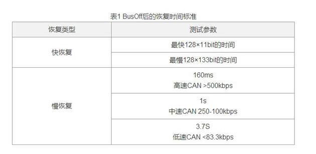 當(dāng)CAN通信出現(xiàn)故障時,CAN控制器會讓故障節(jié)點從主動錯誤狀態(tài)進(jìn)入被動錯誤狀態(tài),甚至進(jìn)入總線關(guān)閉(Busoff)狀態(tài),使故障節(jié)點脫離總線的通信,使其不影響正常節(jié)點的通信,但該控制方案將導(dǎo)致在系統(tǒng)重新上電之前,進(jìn)入總線關(guān)閉狀態(tài)的節(jié)點會持續(xù)無法與其他節(jié)點做數(shù)據(jù)的交互,如若節(jié)點只是暫時的故障,那讓節(jié)點實現(xiàn)自恢復(fù)的功能,則是更為上乘的控制方法。所以CAN總線設(shè)計規(guī)范對于CAN節(jié)點的Busoff自恢復(fù)方式做了嚴(yán)格的規(guī)定,充分考慮了偶發(fā)故障與持續(xù)故障的處理。具體規(guī)范如表 1所示,為測試標(biāo)準(zhǔn)“GMW14242 BusOff后的恢復(fù)時間”。目前多家整車廠對其系統(tǒng)供應(yīng)商的設(shè)備也都提出了相應(yīng)的Busoff后恢復(fù)時間的控制策略要求。
