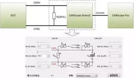 1. 本測試使用CANScope-Pro和CANScope-StressZ。需要DUT上電后,初始化控制器后,發(fā)送CAN報文或者通過CANScope觸發(fā)DUT發(fā)送報文。CANScope勾選總線應(yīng)答。如圖 1所示,進(jìn)行測試連接。使能CANScope-StressZ的RHL為60歐。