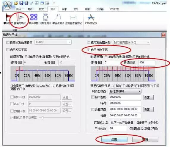 3. 打開CANScope-Pro的“錯誤與干擾”,將“接受干擾”使能,并且將“持續(xù)時間”改為100,點擊“應(yīng)用”。如圖 2所示。此時即可實現(xiàn)較高的干擾強(qiáng)度,保證每一個DUT發(fā)出的報文都可以被干擾。