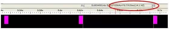 然后將流量分析界面縮小,測量兩個干擾團(tuán)之間的時間間隔,即為BusOff后的恢復(fù)時間。如圖 4所示為70.7915ms。