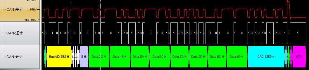 再看看這個案例,可以看到在波形的后半部分也出現(xiàn)了臺階式的幅值增高,光標卡住的顯性電平區(qū)間可以看到寬度明顯超過了5個標準位寬,按照CAN總線的位填充規(guī)則(不能存在連續(xù)六個相同的顯性位或隱性位)表明這是一條錯誤幀。但是不要誤會,并不是因為這個幅值“異?!倍鴮?dǎo)致的錯誤幀,我們知道CAN總線有錯誤重發(fā)機制,以保證總線傳輸數(shù)據(jù)的可靠性。這種可靠性正式通過錯誤幀的“一票否決制”實現(xiàn)的。當(dāng)網(wǎng)絡(luò)中某一節(jié)點識別到一條認為是有問題的報文后會發(fā)送六個連續(xù)的顯性位(即錯誤幀),投出這一否決票通知網(wǎng)絡(luò)上所有其他節(jié)點,本條報文無效。此后其他節(jié)點會以“跟票”的形式全部發(fā)出六個顯性位錯誤幀。所以此時多個節(jié)點重疊部分的錯誤幀的幅值就會高一些了。