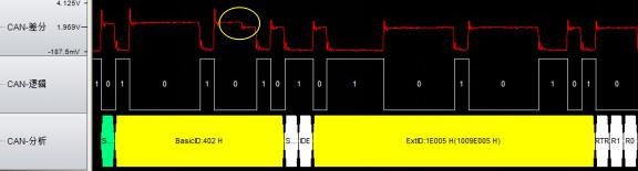 最常見的,當(dāng)CAN網(wǎng)絡(luò)上存在3個以上的節(jié)點時,應(yīng)答位上的幅值要明顯高于同一報文的其他位置,如下圖所示??梢钥吹綀笪脑贗D段、數(shù)據(jù)段、CRC校驗段處的幅值均比較一致,但是到應(yīng)答位處時幅值出現(xiàn)突增。這是為什么呢,大家都知道CAN-bus總線擁有自動應(yīng)答機制,即當(dāng)某一節(jié)點發(fā)送完一幀報文時,所有總線中的其余非只聽節(jié)點均會在應(yīng)答位處做出響應(yīng),如果報文被成功識別則發(fā)出一個顯性位做為應(yīng)答信號。結(jié)合上文所述,應(yīng)答位此時CAN總線上的電流是若干節(jié)點電流疊加的綜合,所以應(yīng)答位的幅值高就很容易講通了。