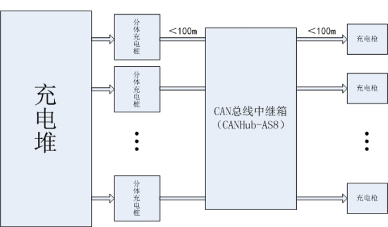 分體式充電樁往往一個充電堆配套十幾個充電樁,大電流線與通訊線并行、遠距離通訊和多路CAN總線通訊,要求中繼器具備以下特點:隔離干擾、良好的信號優(yōu)化能力、多路CAN接口、能兼容不同波特率。