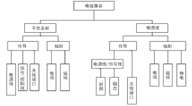 電磁兼容主要有兩方面的內(nèi)容,一個是產(chǎn)品本身對外界產(chǎn)生不良的電磁干擾影響,稱為電磁干擾發(fā)射EMI;另一個是對外界電磁信號的敏感程度稱為電磁敏感度EMS。干擾源、相合途徑及敏感設(shè)備是電磁兼容的三要素,缺一不可。電磁兼容的詳細(xì)內(nèi)容如圖1所示。