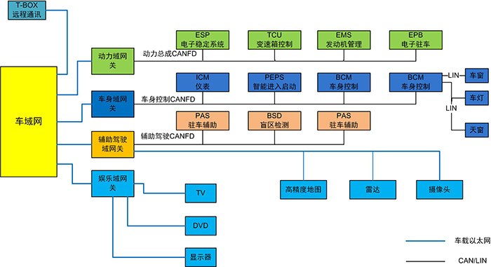 如圖2所示,以車載以太網(wǎng)作為骨干網(wǎng)絡(luò),將核心域控制器(動(dòng)力總成、車身、娛樂(lè)、ADAS)連接在一起。各個(gè)域控制器在實(shí)現(xiàn)專用的控制功能的同時(shí),還提供強(qiáng)大的網(wǎng)關(guān)功能。在域控制器的下方,各部件之間通訊基本是通過(guò)CANFD來(lái)實(shí)現(xiàn)數(shù)據(jù)共享,其中車窗、車燈以及天窗是通過(guò)LIN總線進(jìn)行數(shù)據(jù)傳輸?shù)?。這種基于域控制器的架構(gòu)改變傳統(tǒng)的車載網(wǎng)絡(luò)中ECU到ECU的點(diǎn)到點(diǎn)通信方式。