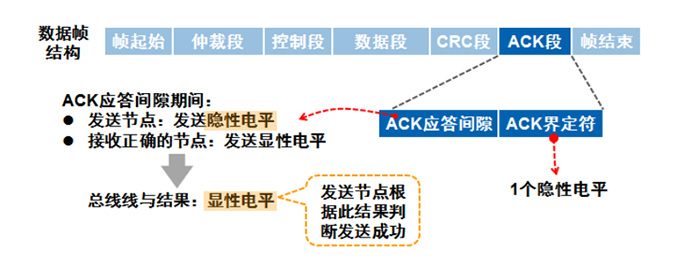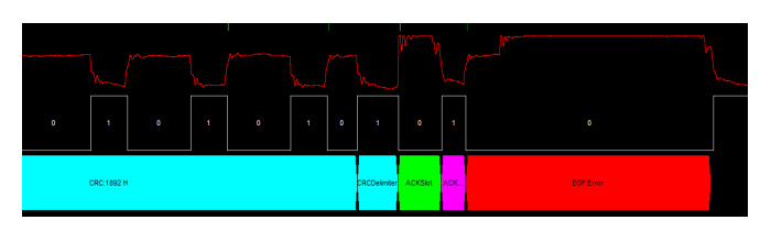 由于ACK界定符被前面的應答場嚴重壓縮,導致被某個節(jié)點識別為顯性(原本是隱性),所以這個識別錯誤的節(jié)點后面發(fā)出了錯誤幀,進行全局通知,讓發(fā)送節(jié)點重新發(fā)送。