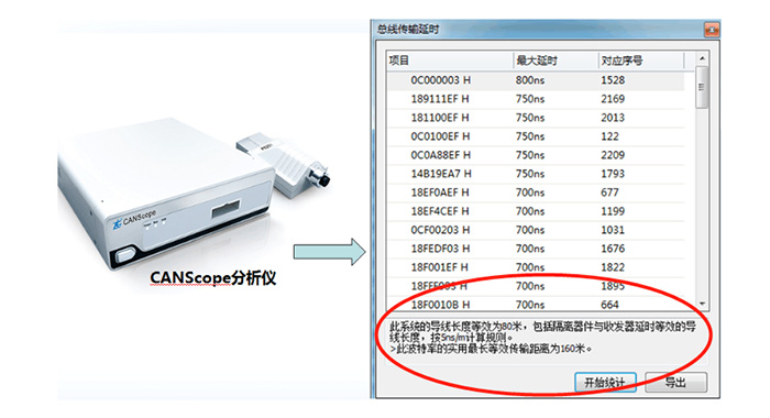 CANScope分析儀可以提供傳輸延遲測量的功能,可以進行單幀的延遲測量,也可以進行所有波形的延時統(tǒng)計。如圖3所示,可以通過延遲測量出導線的等效長度,即最大延遲÷5ns/m,并給出該波特率下最長等效傳輸距離。