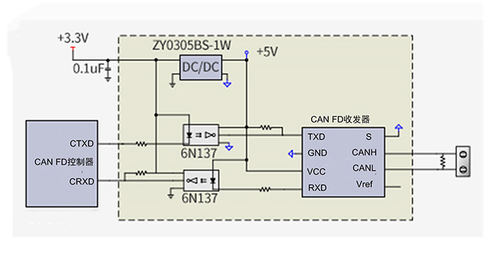 常用的解決方案有光耦+CAN FD收發(fā)器,如圖5所示。圖中光耦6N137具有典型的單向延時60ns,加上全部信號雙向傳輸會造成240ns延時。