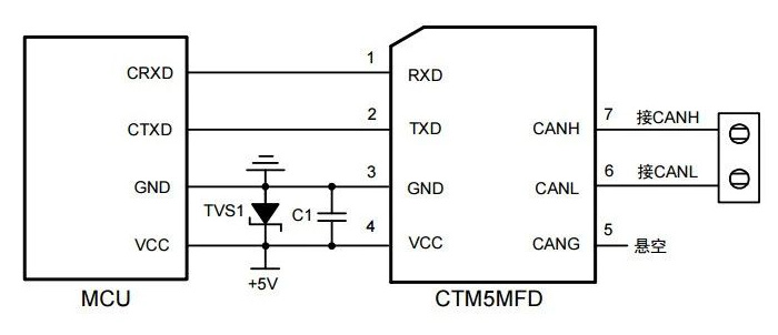 相比上述分立器件的隔離方式,也可以采用隔離收發(fā)器的方案,如圖6所示。例如,CTM5MFD采用磁耦隔離方式,延時時間在3~5ns。這種情況下,基本不會影響總線容許通信線纜長度。