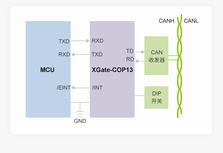 XGate-COP13通信模塊是一款使用簡(jiǎn)單方便的CANopen從站模塊,模塊內(nèi)部已經(jīng)固化了CANopen從站協(xié)議棧,使用致遠(yuǎn)電子的簡(jiǎn)單串口通信協(xié)議就能實(shí)現(xiàn)與XGate-COP13的通信,如下圖所示:
