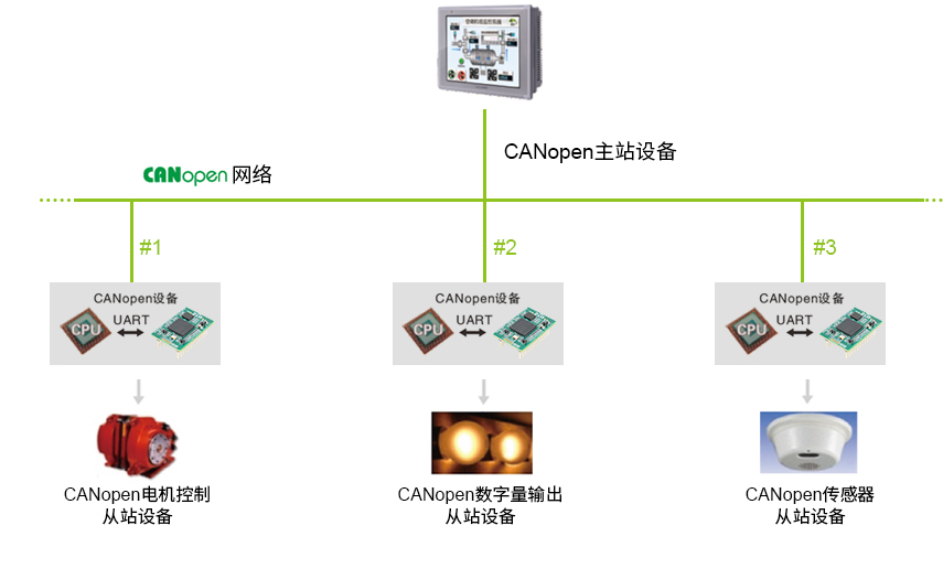 利用XGate-COP13設(shè)計(jì)的CANopen設(shè)備在網(wǎng)絡(luò)中的結(jié)構(gòu)如下圖所示,通過(guò)CANopen主站設(shè)備可以輕松的實(shí)現(xiàn)對(duì)各個(gè)CANopen從站的控制。