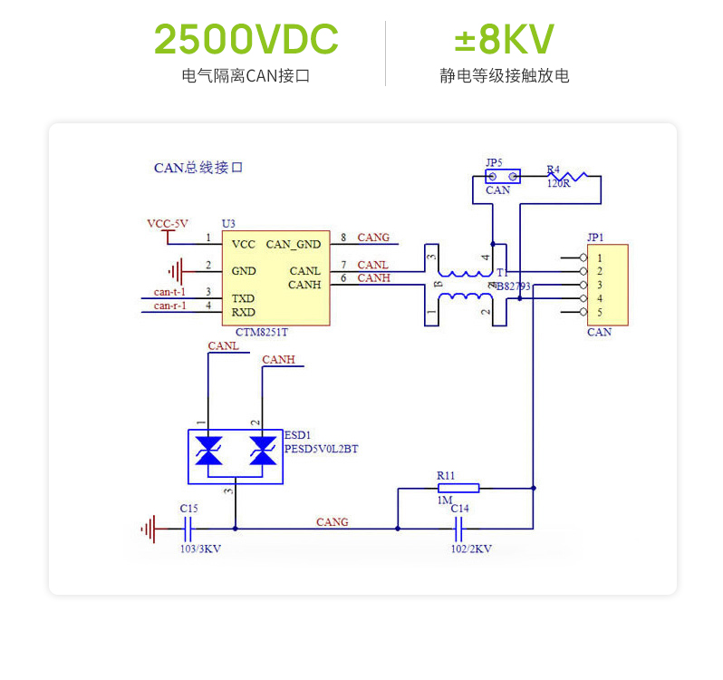 按致遠(yuǎn)電子推薦的CAN收發(fā)電路設(shè)計(jì),可達(dá)2500VDC電氣隔離CAN接口,靜電等級(jí)接觸放電±8KV。