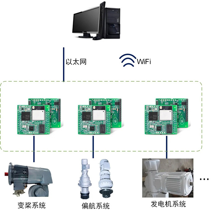 節(jié)點(diǎn)故障一般是變槳控制板造成的,為了方便工程師調(diào)試,可以變槳控制板上預(yù)留出WiFi接口。ZLG致遠(yuǎn)電子基于此行業(yè)應(yīng)用需求,推出有線和無線的模塊監(jiān)控方案。如圖所示,將WZNE-1100模塊安裝在風(fēng)機(jī)控制板上,即可輕松實(shí)現(xiàn)以太網(wǎng)/WiFi轉(zhuǎn)串口數(shù)據(jù)的互聯(lián)互通,這也是本文的重點(diǎn)所在。