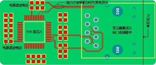 c) 網(wǎng)口變壓器PHY層芯片側(cè)中心抽頭對地的濾波電容要盡量靠近變壓器管腳,保證引線最短,分布電感最??;