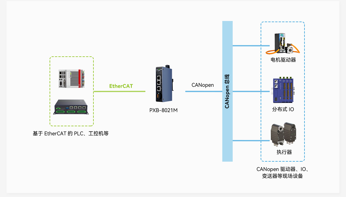 PXB-8021M產品是致遠電子推出的EtherCAT轉CANopen主的協(xié)議轉換器。該協(xié)議轉換器提供簡單好用的上位機配置工具,僅需一連一配,輕松實現(xiàn)CANopen網絡到EtherCAT網絡間的無縫轉換。