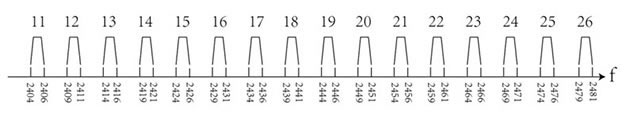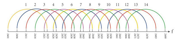 Wi-Fi 在802.11b/g的標(biāo)準(zhǔn)的工作頻段為2.4GHz(2.4GHz-2.4888GHz),劃分為14個信道,每個信道帶寬為22MHz , Wi-Fi頻譜列表如下所示: