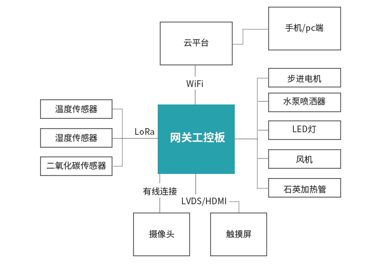 攝像頭監(jiān)控:監(jiān)控攝像頭通過Wi-Fi模組將圖像數(shù)據(jù)上傳云端,網(wǎng)關工控板也通過Wi-Fi將數(shù)據(jù)上傳到云平臺、手機、PC端可以實時查看數(shù)據(jù)、設定數(shù)據(jù)值。下文將詳細介紹每個環(huán)節(jié),包括溫室大棚自動化控制,云監(jiān)控平臺,顯示控制、人員管理系統(tǒng)。